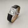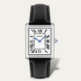 - Features: Roman numeral dial, precision quartz movement, rectangular polished design